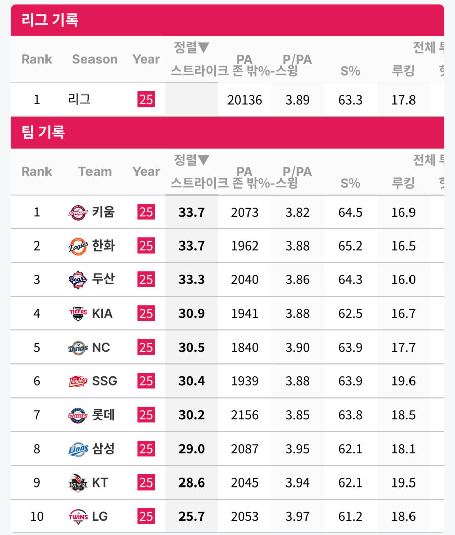 스트존 밖 헛스윙률이 키움이랑 더불어 리그 1위임