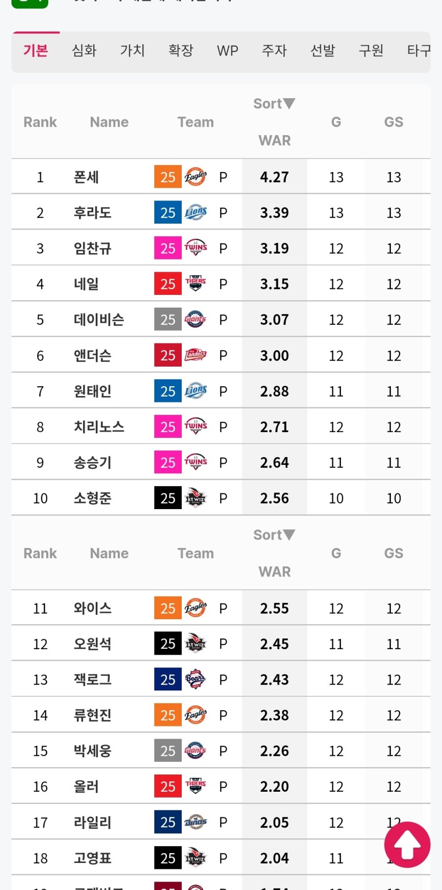 war 국내선발기준 임찬규 원태인다음 3위