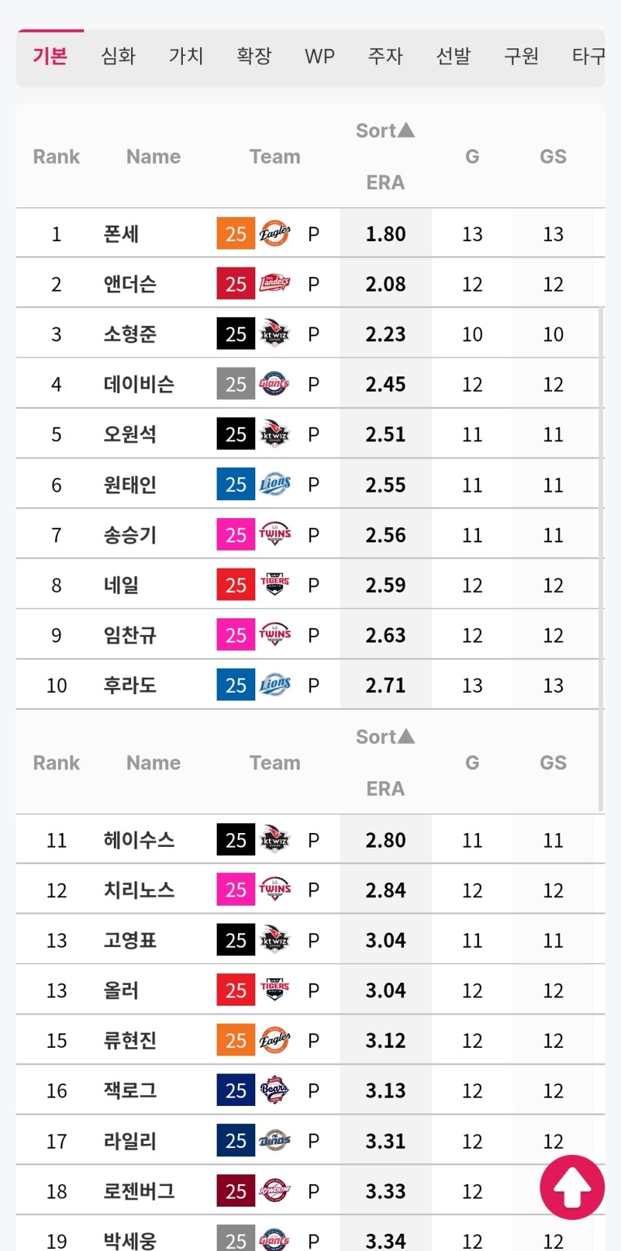 whip 국내선발기준 원태인 소형준다음 3위