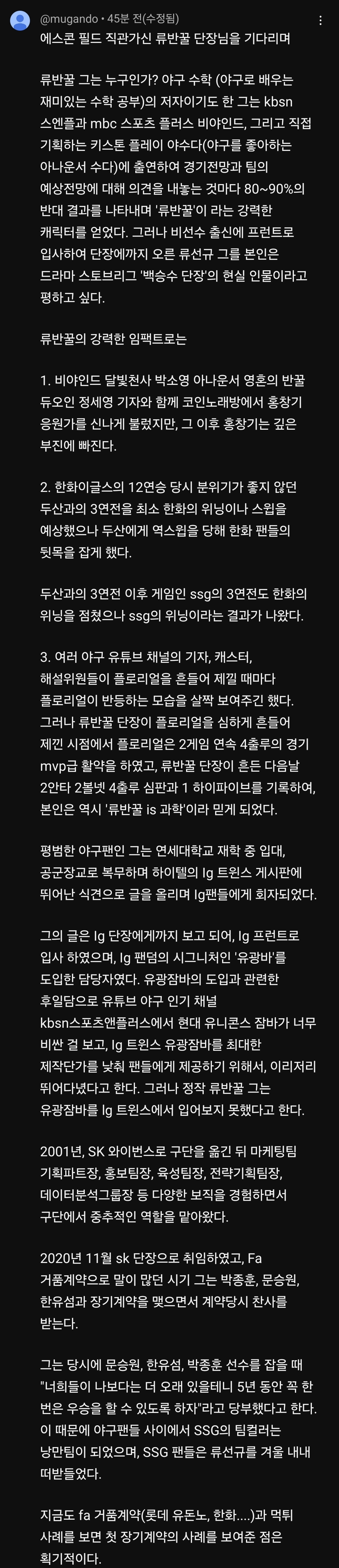 유튜브에서 이 글을 봤는데 류선규 단장에 대한 이야기네요 참 우연치고는 너무 잘맞는다