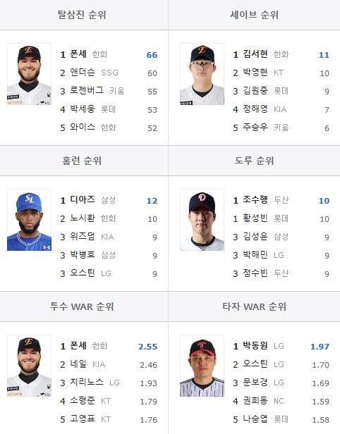 캬.. 탈삼진 1위 폰세.. 세이브 1위 김서현, 투수 war 1위 폰세 ㄷㄷㄷㄷ