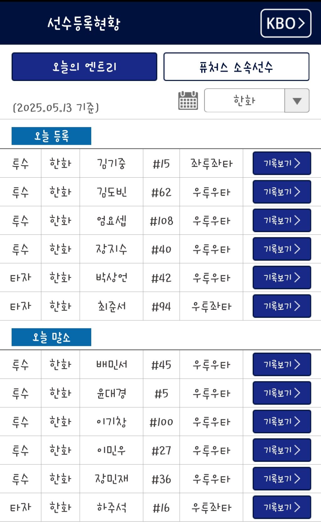 퓨처스에서 하주석 선수가 말소 되었고 배승수선수는 선발로 출장하네요.