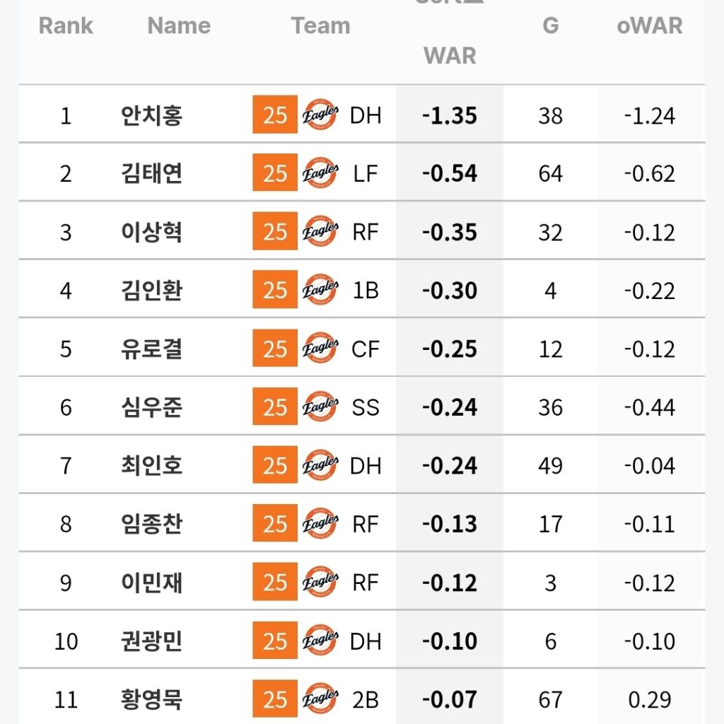 김태연은 개막이후 계속 1군에 있는데 -0.54라는게 충격이네요. 안치홍은 -1.35구요.