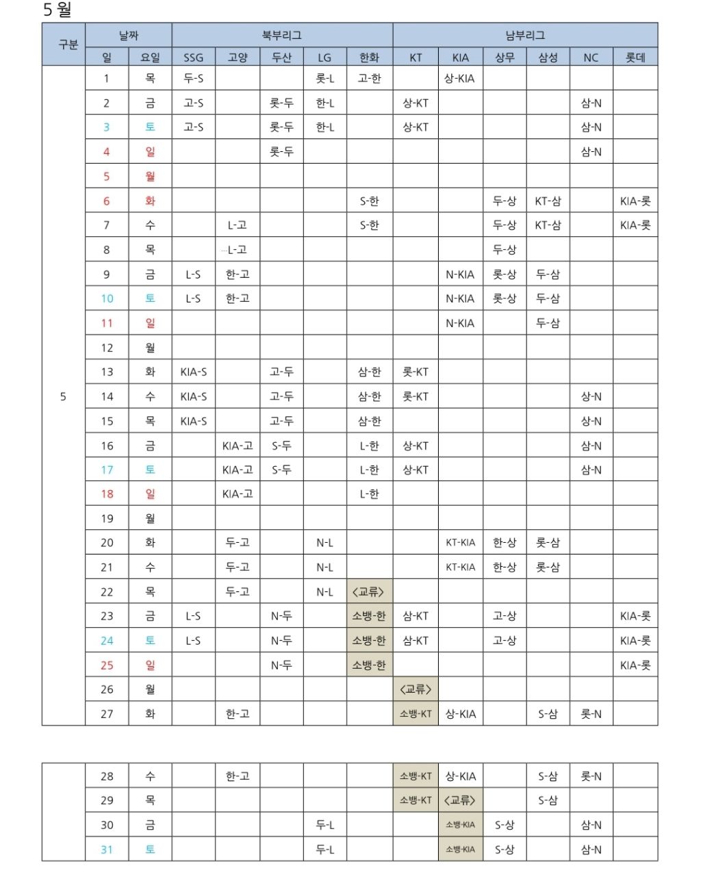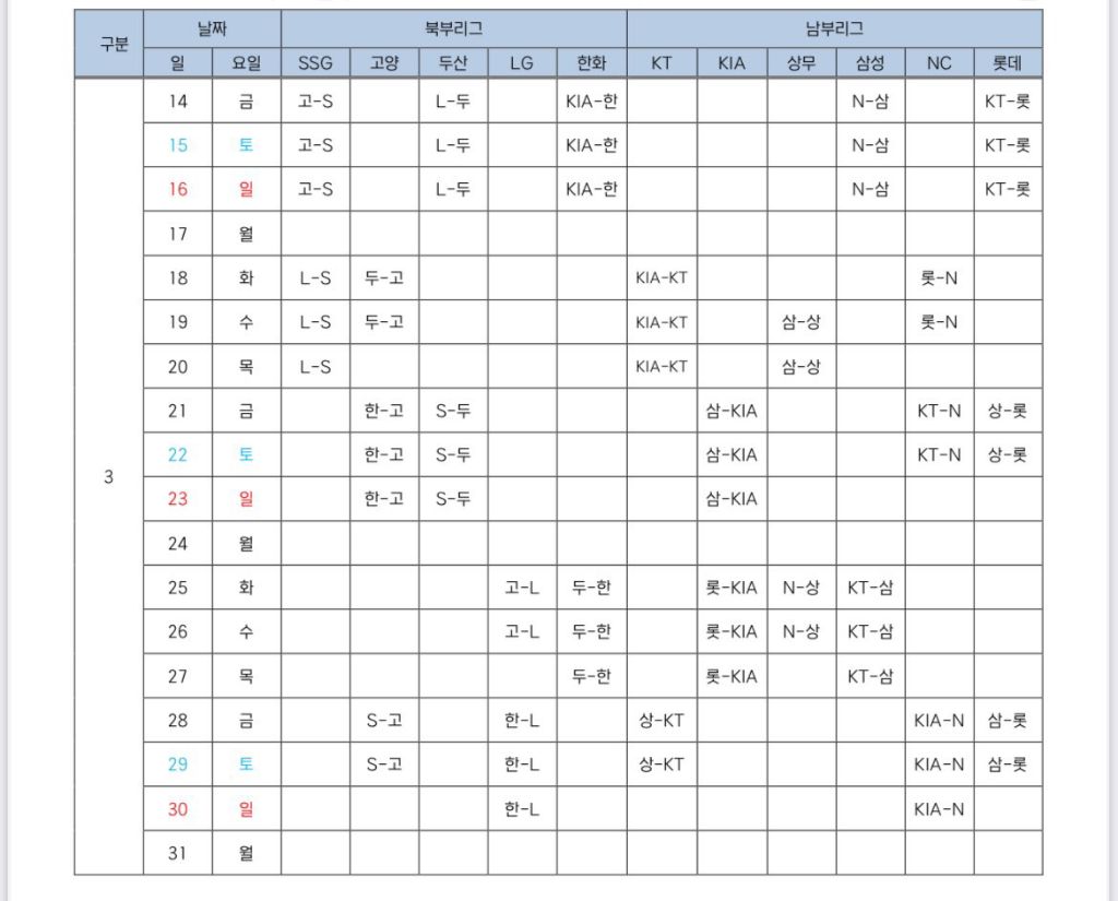 개막전은 강화(고양-SSG), 이천(LG-두산), 서산(KIA-한화), 경산(NC-삼성), 상동(KT-롯데) 총 5개 구장에서 개최됩니다.