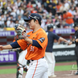 (대전=뉴스1) 김기남 기자 = 15일 대전 한화생명볼파크에서 열린 프로야구 '2025 신한 SOL 뱅크 KBO리그' 한화이글스 대 LG트윈스 경기에서 5회초 한화 문현빈이 LG 2사 이주현 안타에 2루주자 문성주를 홈에서 아웃 시키며 환영을 받고 있다. 2025.6.15/뉴스1