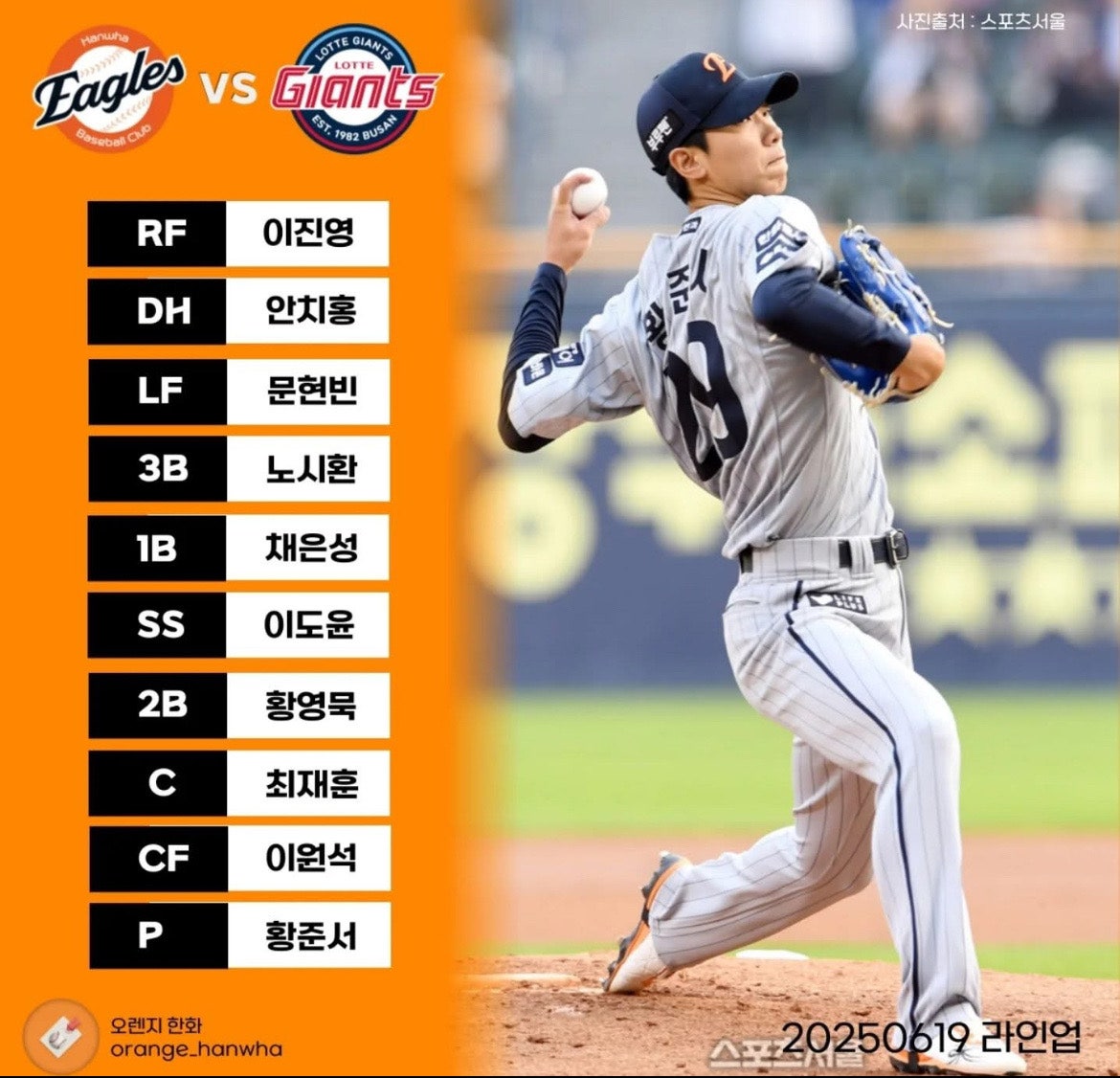 오늘 한화이글스 야구 라인업이에요