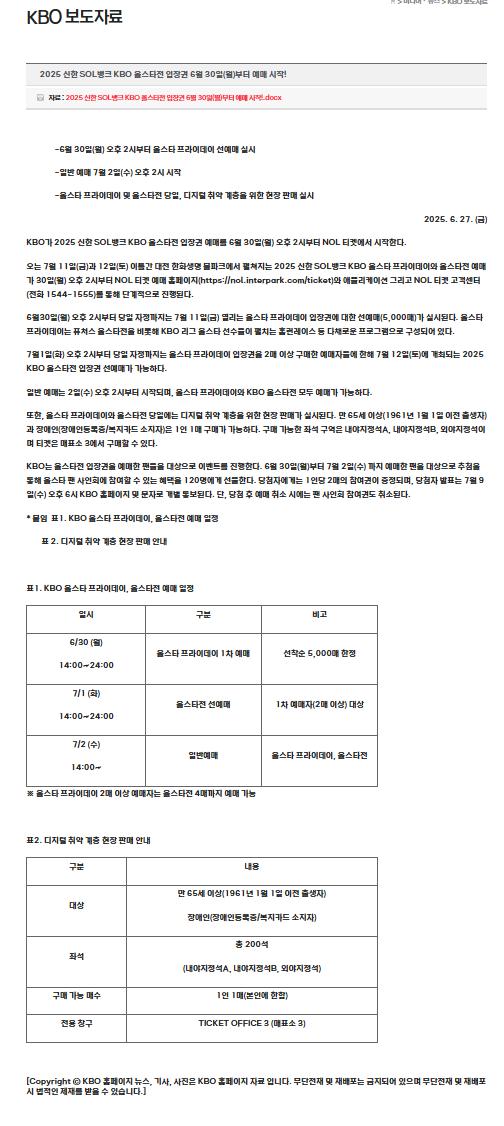 한화이글스팬카페 - 올스타전 예매(크보 오피셜 보도자료) (1) 90.5KB 5